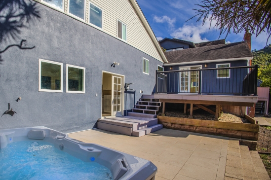 Recent updates include: Fresh interior and exterior paint, Quartz kitchen countertops with updated cabinetry and hood, New dishwasher (2025) and oven (2022), Trex exterior deck railings, 325-gallon Hot Springs 4-person hot tub with custom electrical breaker box (2023) — Additional highlights: Hunter Douglas custom blinds throughout, Two classic cast iron tubs, Dedicated custom-built workbench, Expansive wood-burning fireplace in the living room, Professionally cleaned carpets (Sept-25’)